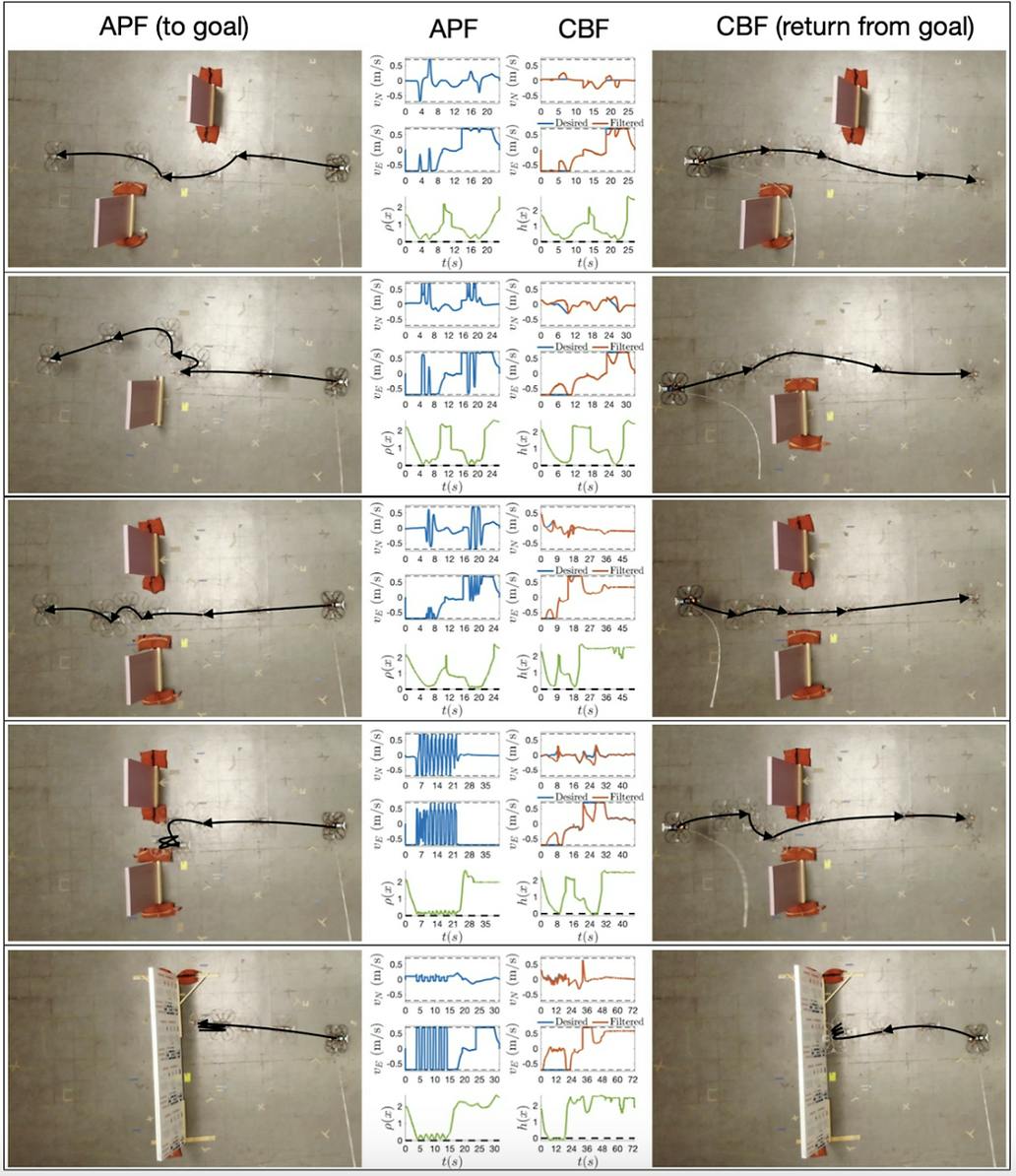 While we showed in the above examples that CBFs outperformed APFs, many would argue that well-tuned APFs would achieve similar levels of performance or better. The core advantage that CBFs have, however, is in their rigor.
