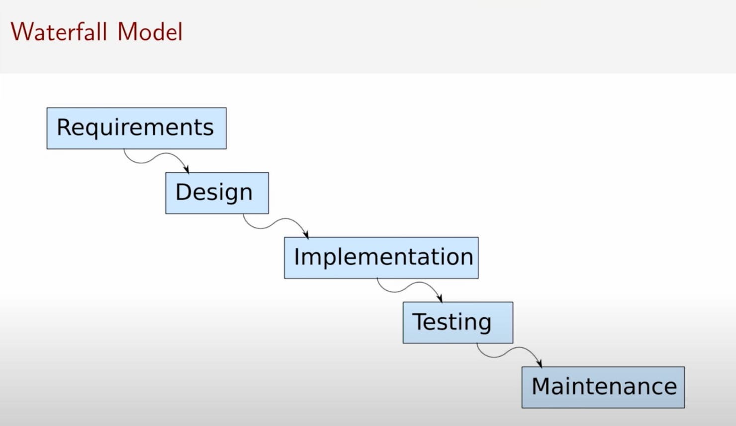 The waterfall model is an old methodology for software development, going from requirements to design to implementation to testing to maintenance. This is no longer very practical, as it’s very difficult up-front and hard to maintain. Moreover, if you are running short on time and need to deliver, testing is the first thing that is cut.