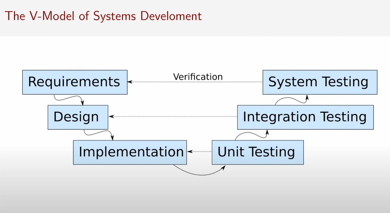 Functional safety standards want you to follow the V-model of systems development, shown below, which was developed in the 1980s. With this model, with each step from the waterfall method, you are doing testing and verification.