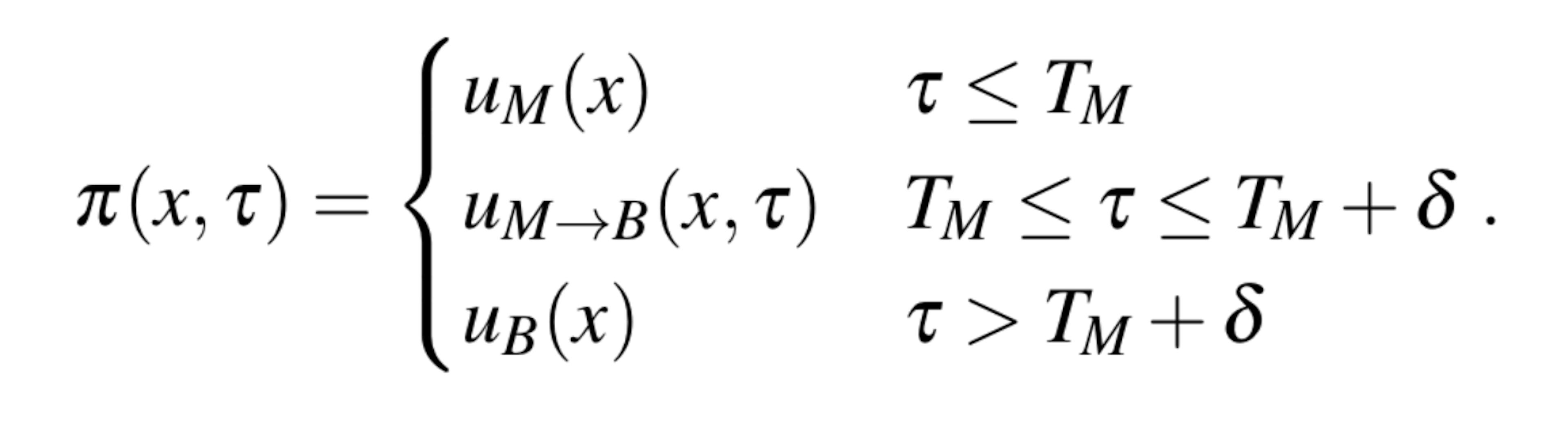 This method extends a single failsafe maneuver to a multiple failsafe policy without any of the drawbacks of evaluating different policies and ensuring a continuous failsafe function. It accomplishes this by having a failsafe function from t0 to tf and let’s say the “switch lanes” policy from t0 to t1 and the recovery policy from t1 to tf. The method by default sets the time of the function to t1 and if the failsafe policy from t0 to t1 is valid, it sets the time to t0. (cf next figure)